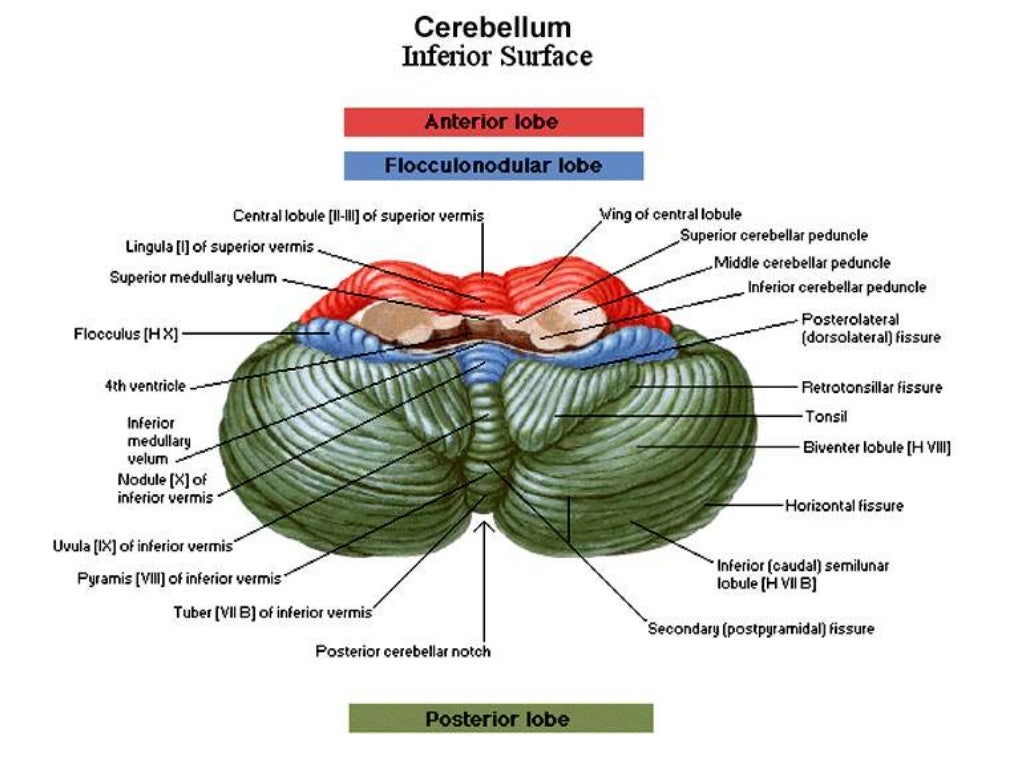 Cerebellum Anatomy Biology Diagrams The cerebellum constitutes the largest part of the hindbrain. It lies behind the pons and medulla oblongata; between its central portion and these structures is the cavity of the fourth ventricle. It rests on the inferior occipital fossรฆ, while above it is the tentorium cerebelli, a fold of dura mater which separates it from the tentorial surface of the cerebrum. It is somewhat oval in form Origin and location The cerebellum arises from the rhombencephalon or hindbrain. More specifically, it arises from the rhombic lips or alar plates (dorsal thickening of the neural tube that forms the sensory areas of the nervous system) of the metencephalon (spans between the pontine flexure and the rhombencephalic isthmus).. It is an ovoid structure that resides in the posterior cranial fossa