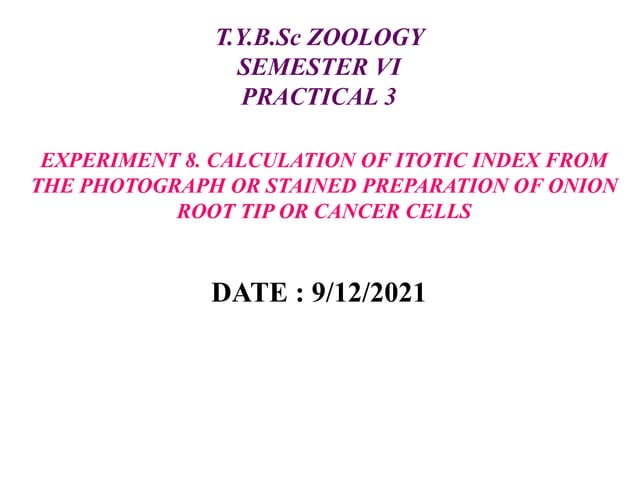 The mitotic index is calculated using the formula: Aim To use prepared slides (Allium spp) to observe cells in mitosis and determine the mitotic index. Hypothesis Suggest how the mitotic index will differ between the tip and the base of a growing plant shoot. Interphase Prophase Metaphase Anaphase Telophase !"##$ &' (&)*$&$ +*),# -./0"1 *2 To calculate the mitotic index, a sufficient number of cells must be counted to ensure statistically reliable data. Count at least 1,000 cells in random microscopic fields to avoid any potential bias. Separate the counts into the following two categories: 1. Mitotic cells (M): Cells in any stage of mitosis (prophase, metaphase, anaphase, or